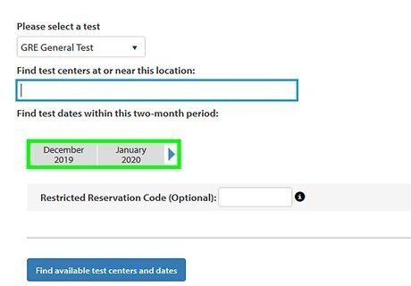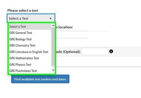 Select the test that you’re taking from the drop down menu. Different tests are administered at different testing sites. To find a testing site that offers the right exam, click the “Please Select a Test” tab to pull up the drop down menu. Select the specific test that you’re going to take. Consult the schools that you plan on applying to in order to determine which GRE exam they require. The GRE general test is the most common option for graduate programs.