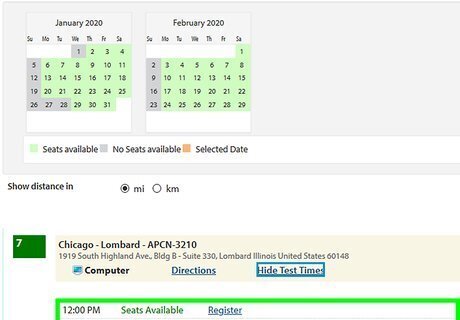 Click the link at the top of the page to view test centers near you. At the top of the page, there is a blue link that says “View Test Centers, Test Dates, and Seat Availability.” Click this link to pull up the test finder page.