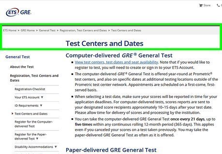Visit the ETS test center page to begin registering for your exam. The GRE test is conducted at various private testing centers all over the world. To find a test center near you, log into your ETS account and click the tab on the left side of the page labeled “Test Centers and Dates.” You can take the GRE on a computer or on paper. Both tests are identical in terms of content, and both of them must be completed at a testing center. You can visit the test centers and dates page at https://www.ets.org/gre/revised_general/register/centers_dates/. You can take the GRE in many countries outside of the United States, but the exam is almost exclusively used to apply to schools in the United States.