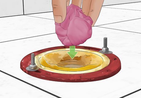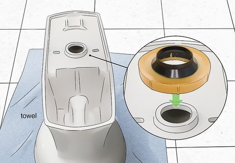 Place the new wax seal. Place the new toilet on its side on top of a towel or other padded surface. Then place the new wax seal over the hole, with the plastic or rubber facing out. Push it hard into place and turn it slightly like a doorknob to get it to stick in place.