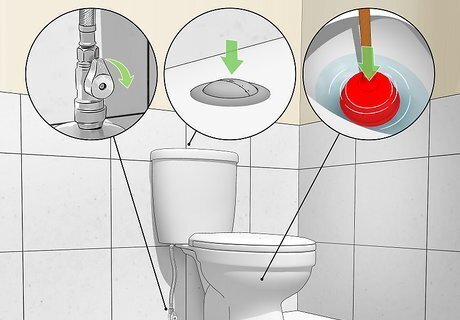 Get rid of all the water. Turn off the water at the supply valve. Flush the toilet to remove most of the water (holding down the flusher for as long as possible). Remove the remaining water from the bowl by forcing it down with a plunger and mopping up the remaining water with a sponge. Then, remove the remaining water in the tank with the sponge as well.