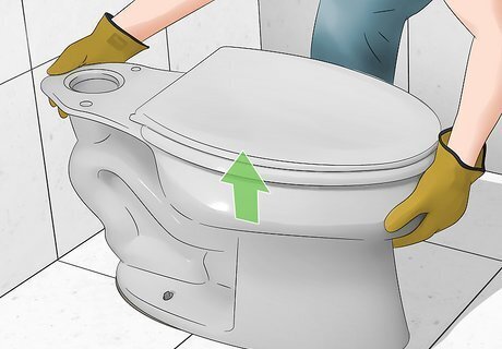 Remove the tank. Straddling the bowl, place a hand on either side of the base of the tank and lift it off, rocking it side-to-side a little to ease it off and making sure to bend with your knees. Put it somewhere out of the way but be sure to put it somewhere water resistant, as there may be residual water.