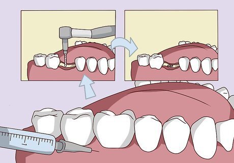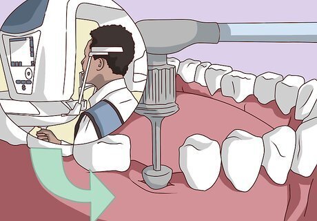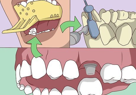 Get surgery to implant a post into your jawbone. Your dentist will sedate you or give you anesthesia so you don't feel any pain during the procedure. Then, they'll drill a hole through the gum where the tooth used to be. Once they reach the jawbone, they'll insert a titanium post in the bone, which will act like the new tooth's root. You'll still have a gap where the old tooth used to be. You can either wait for the remaining surgeries to get the tooth or ask your dentist to install a temporary denture in the meantime. If you are sedated or have general anesthesia during the surgery, ask a friend or family member to drive you home once the surgery is over.