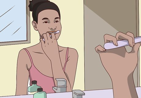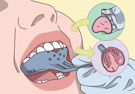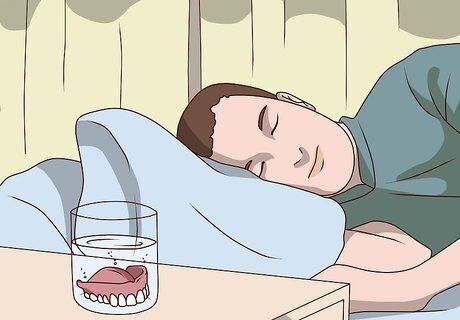 Remove the denture before bed and soak it while you sleep. Most dentures aren't meant to be worn all of the time, so most dentists recommend taking them out before you sleep. Put the partial denture in a glass of warm water and brush it in the morning before you put it back in your mouth. Wash the denture with soapy water or denture paste.