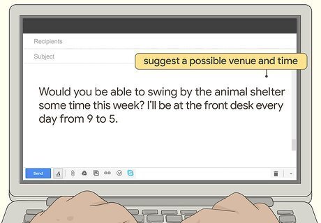 Suggest a possible venue and time for your meeting. Try thinking of a place that’s well-known and easily accessible to the recipient. If you work in the same building or general location as the person you’re emailing, see if you can meet during a lunch break. If you and the recipient don’t live or work in a nearby location, try suggesting a restaurant or other public area where you could meet. Additionally, mention a range of times that work for you, so the recipient can tell you their availability more easily. If you both have busy schedules, consider scheduling a phone or video conference meeting. For instance, draft something like this: “Would you be able to swing by the animal shelter some time this week? I’ll be at the front desk every day from 9 to 5.”