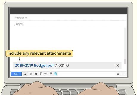 Include any relevant attachments that relate to the meeting. Attach any documents, spreadsheets, or other relevant files that could help prepare the recipient for the meeting. If you’re reaching out to someone regarding a complex topic, include whatever pamphlets or data sheets are needed to help the recipient understand the topic of the meeting. For instance, if you’re discussing budget changes for an upcoming event, you might want to include a spreadsheet of the previous year’s budget.