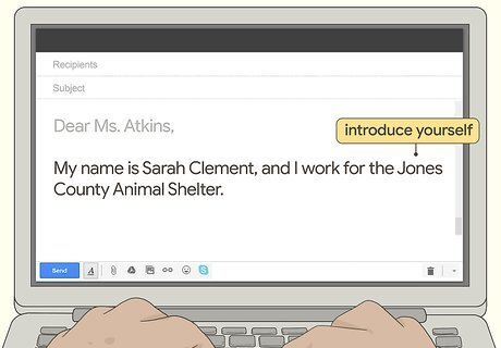 Introduce yourself if you’re meeting with a complete stranger. Dedicate your first paragraph to a brief introduction if you’re writing to a public official or other person that you’ve never met before. Focus on your name, position, and professional connection, so the recipient knows who you are and why you’re reaching out to them. If you’re contacting someone you already know, like a boss or coworker, don’t feel obligated to include an introductory paragraph. Your introduction shouldn’t take a long time to read. Try writing something like this:Dear Ms. Atkins,My name is Sarah Clement, and I work for the Jones County Animal Shelter.
