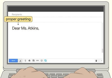 Use a proper greeting to start off your email. Try using a standard, formal greeting when you start writing your message. If you’re reaching out to a public official or other distinguished individual that you’ve never met, use their full title in the heading. If you’re contacting a coworker or superior, use an honorific such as “Mr.,” “Mrs.,” “Mx.,” or “Miss.” As a general rule of thumb, try using greetings like “Dear,” “Hello,” and “Hi” to start off your email. If you’re addressing a general office or group instead of an individual, use “To whom it may concern” instead. For example, if you were reaching out to your superior, try drafting the salutation like this:“Dear Mr. Jackson,I hope this email finds you well! I wanted to reach out to you in regards to a possible meeting.”