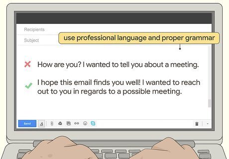 Use professional language and proper grammar throughout the email. Proofread your message for any obvious grammatical errors and spelling mistakes, so your final draft looks as polished and clean as possible. Additionally, remove any abbreviations or slang that make the message seem more casual, or more difficult to understand. If your final draft doesn’t look and sound professional, then the recipient might not take your request seriously. While emojis can be fun to use in texts and casual emails, you shouldn’t use them to request a meeting.