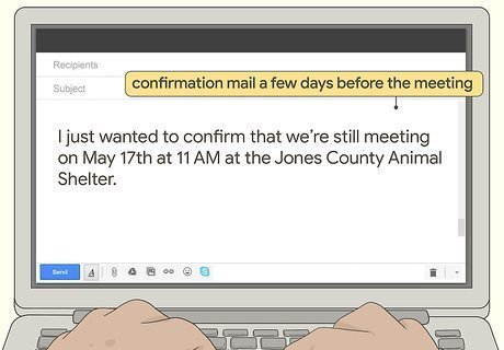 Send a reminder or confirmation a few days before the meeting. If you’d like to be extra prepared before the scheduled meeting, try sending a confirmation email to the recipient as a reminder. Don’t make this email too long—instead, state the day, time, and place that you plan on meeting in order to double-check that the meeting is still on as scheduled. For instance, write something like this:I just wanted to confirm that we’re still meeting on May 17th at 11 AM at the Jones County Animal Shelter.