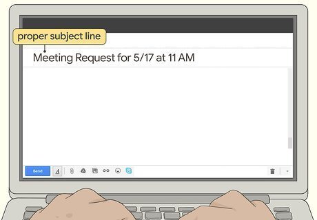 Mention in the subject line that you’d like to meet. State your purpose clearly in the subject line of the email, so the recipient knows immediately that you’d like to meet with them. Avoid using vague language like “Meeting” or “Possible Meeting Time.” Instead, use specific dates and time frames in the subject line so your recipient knows what to expect right away. For example, type something like this: “Meeting Request for 5/17 at 11 AM.”