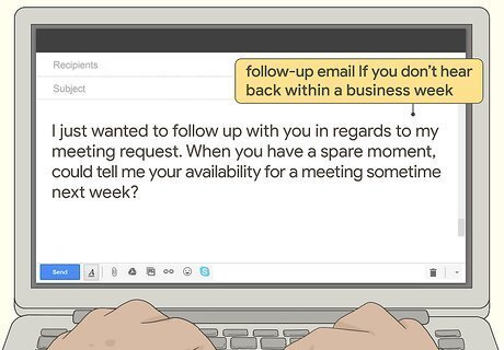 Draft a follow-up email if the recipient doesn’t get back to you in 3-5 days. Give the recipient a few days to read and reply to your request. If you don’t hear back within a business week, send the person a quick email to remind them that you’re waiting for a reply. Stress that you’re grateful for the opportunity to meet them, and that you’re thankful for their time. Follow up calls are also an efficient way to check in with the person you’re trying to meet with. For example, draft something like this: “I just wanted to follow up with you in regards to my meeting request. When you have a spare moment, could tell me your availability for a meeting sometime next week?”