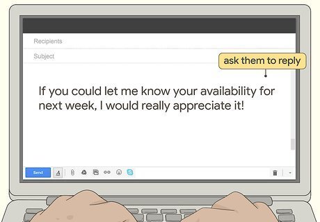 Ask that the recipient replies to your message. Since you’re technically scheduling an event, politely ask that the recipient replies with their availability. If you’re contacting an especially busy individual, remember that they might take a day or 2 to respond. back. For example, say something like this: “If you could let me know your availability for next week, I would really appreciate it!”