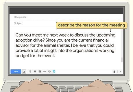 Describe the reason for the meeting and its overall importance. At the beginning of the email (following your introduction, if you chose to include one), state the type of meeting you’d like to have with the recipient, and whether it will be a formal or casual affair. Once you’ve explained what the meeting is for, expand on why the meeting is important to the task that you’re trying to complete. Try to keep your explanation brief, as your recipient might not have a lot of time to go through your email. For instance, try writing something like this: “Can you meet me next week to discuss the upcoming adoption drive? Since you are the current financial advisor for the animal shelter, I believe that you could provide a lot of insight into the organization’s working budget for the event.”