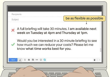Iron out the meeting specifics in an additional email. Negotiate with other person’s schedule once they reply. Take note of the other person’s availability, and confirm a meeting time on a date when you’re both available. Try to confirm a date and time within 1-2 emails to avoid any confusion and clutter in your inbox. Try to be as flexible as possible. If you’re reaching out to a busy person, they might not be able to meet with you right away. Don’t schedule a meeting at the last minute. If the recipient is busy, you might not be able to agree on a date to meet.