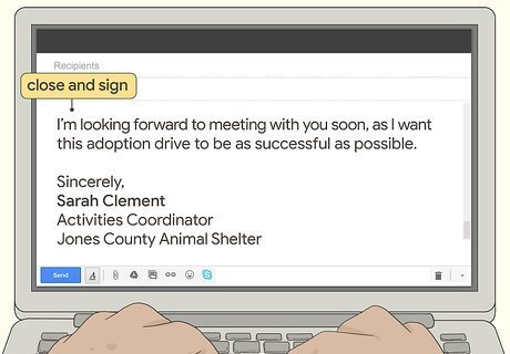Use cordial closing language when ending the email. Draft a closing sentence that rehashes the purpose of your email, so the recipient clearly understands the purpose of the meeting. Use a friendly tone to sign off your email, using phrases like “Sincerely,” “Thank you,” or “Best wishes.” After writing the sign-off, leave a signature below your name, which restates your position or current career. Cater your language to the recipient. If you’re speaking to a coworker, a sign-off like “See you soon” would make more sense than “Respectfully yours.” If you’re contacting a superior, “Sincerely” or “Best wishes” would be more appropriate than a casual sign-off like “See you.” For example, write something like this:I’m looking forward to meeting with you soon, as I want this adoption drive to be as successful as possible.Sincerely,Sarah ClementActivities Coordinator, Jones County Animal Shelter