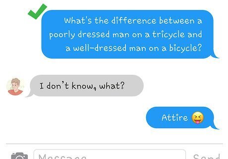 Send him a joke if you want him to know you have a funny side. If the conversation stalls out, break the ice with humor. Show a flirty side, corny side or really funny side but aim to get a laugh or smile. An example of a cheesy, but funny joke would be, “What's the difference between a poorly dressed man on a tricycle and a well-dressed man on a bicycle? Attire.”