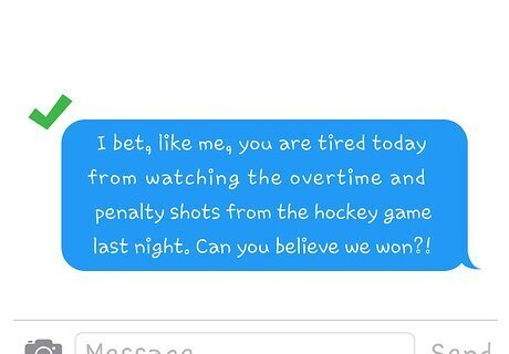 Tell him something new about you to give him something else to comment on. If you have an interest in common with his bio you could share that with him to get more conversation started. Be honest and stay true to your actual interests. Reveal only what you are comfortable with. If both of you like sports try something like, “I bet, like me, you are tired today from watching the overtime and penalty shots from the hockey game last night. Can you believe we won?” This opens the door to discussing mutual interests. Tell him you have a common interest by sharing a detail about yourself, “I am also training for a half marathon. It will be my sixth one. How long have you been running and what distances have you tried?”