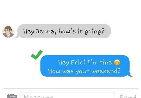 Ask a simple question to keep the conversation going. If you want to steer the conversation in a particular direction, respond with a simple question. Avoid questions that are too personal in the beginning and try to get to know a little more about him. For instance, you can write, “How’s it going?” This is simple but will get the conversation started. You could also try, “What are you up to?” This gives him a chance to tell you about what he’s been doing. A more targeted question could ask, “How was your weekend?” Answering that provides him an opportunity to share some activities of interest to him.