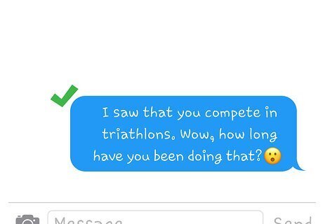 Comment on his biography to point out something that interests you about him. Direct comments on his biography help the guy understand a bit more about why you are interested in him in the first place and give the conversation a direction to go. For example, “I saw that you compete in triathlons. Wow, how long have you been doing that?” This opens the door for more conversation on either of your interests. Another comment could be, “I read in your bio that you have four sisters! I guess you've spent a lot of time around women.” This gives him a chance to share about his family.