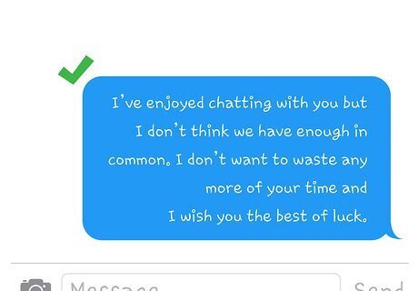 Tell him you are not interested if you don’t want to move forward. Ghosting isn't fun for anyone involved! Be direct and honest. If you've been chatting with this guy for a while, let him know you are not interested and it’s time to move on. If you enjoyed chatting, thank him for the lovely time but let him know it’s not going any further. Try telling him, “I’ve enjoyed chatting with you but I don’t think we have enough in common. I don’t want to waste any more of your time and I wish you the best of luck.”