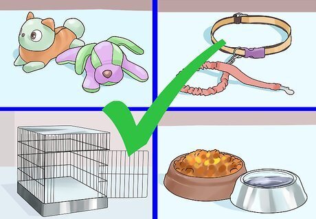 Ensure the dog you’ll give as a gift has everything it needs. Assuming you’ve given dog paraphernalia to the person who will ultimately receive the dog as a gift, there should be no need to buy many more things in preparation of the dog’s arrival at its new home. Still, you and the person who will be bringing the dog home should take a final inventory to ensure that the dog and its new owner have: a collar water and food bowls a leash chew toys ID tags a crate or baby gate to confine the dog when necessary