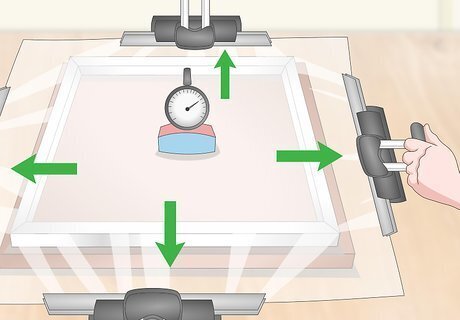 Place the frame on wooden blocks in the middle of your screen stretching machine or device. The wooden blocks will increase the tension between the stretching device and the mesh.