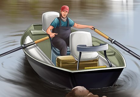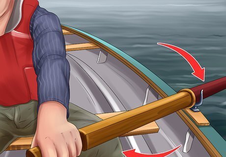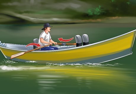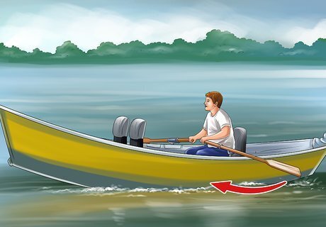 Try turning the boat. Use only one oar and complete the backstroke movement. If you use the right oar, it moves the boat backward and to the left. If you use the left oar, it moves the boat backward and to the right. Try the same movement while holding the other oar steady in the water. This will help to pivot the boat.