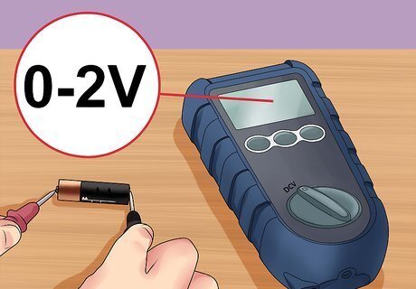 Measure the “direct current voltage” or DCV of the suspect cells. The DCV range that you will be measuring is from 0 volts to 2 volts. A brand new AAA, AA or D cell will all show a reading of just over 1.5 volts.