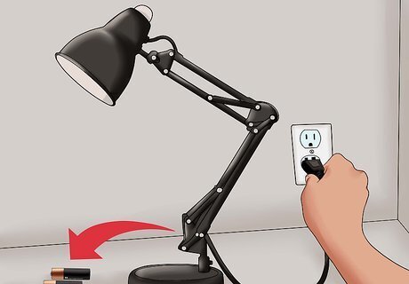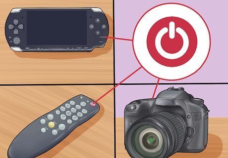 Remove batteries from any electronics being powered by AC (household plug) current. Keeping them installed will lead to an unnecessary drain of capacity. AC current runs from the outlets in our homes because it can travel long distances with little cost. Blu-Ray players, TVs, computers, lamps, and toaster ovens are a few examples of items that run on AC current.