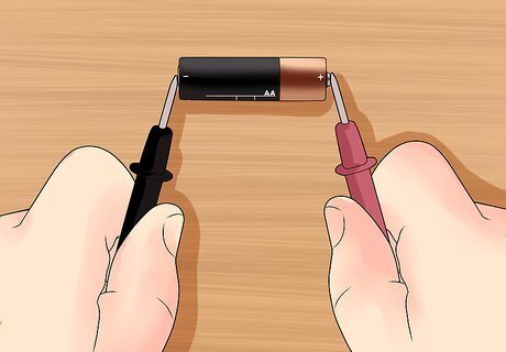 Connect the test leads to the appropriate battery ends. Touch the red test lead probe to the knob on the end of the battery (+). This should be on your right. At the same time touch the black test lead probe to the flat surface end of the cell (-). This should be on your left. Make sure to hold the leads firmly in place to ensure an accurate reading.