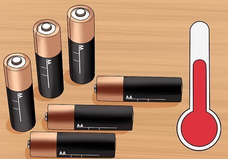 Keep the batteries at room temperature. There is generally no need to refrigerate batteries, as this can cause condensation that leads to corroded contacts (battery ends) and label or seal damage. Temperature extremes, either too hot or too cold, can drain energy from the battery, or cause the batteries to begin leaking. Never attempt to use a battery that shows signs of leaking.