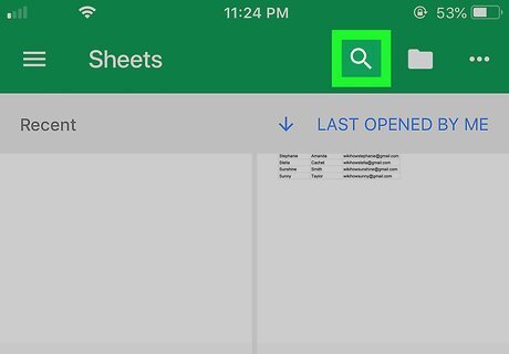 Tap the Android 7 Search icon on the top-right. This button is located on a green navigation bar in the upper-right corner of your screen. It will let you search all your saved spreadsheet files.
