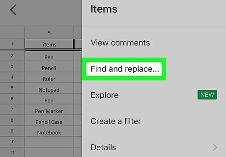 Tap Find and replace on the menu. This option will allow you to search your spreadsheet's contents for a keyword or number.