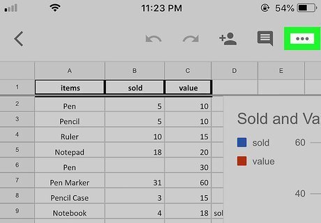 Tap the three dots icon on the top-right. This button is located next to the Android 7 Message icon in the upper-right corner of your screen. It will open a drop-down menu. If you're looking at a shared spreadsheet, you may not see the Android 7 Message icon here.
