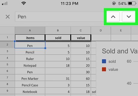 Use the Android 7 Expand Less and Android 7 Expand More icons to browse all the matches. You'll find these buttons next to the search bar on the top-right corner. Android 7 Expand More will jump you to the next matching cell, and Android 7 Expand Less will go back to the previous match.