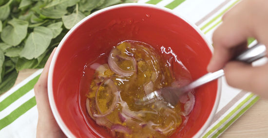 Make a vinaigrette for a delicious, light salad. Combine vinegar with sweet or savory ingredients of your choice. Then slowly whisk in olive oil, beating the mixture until it’s thick. Drizzle the vinaigrette over your fresh spinach leaves. Try combining 2 tablespoons (30 mL) of white wine vinegar, 2 teaspoons (9.9 mL) of Dijon mustard, 2 teaspoons (9.9 mL) of grated onion, ⁄2 cup (120 mL) of olive or vegetable oil, and ⁄4 teaspoon (1.2 mL) of lemon juice for a slightly spicy, acidic dressing. Add bacon bits and sliced mushrooms to the fresh spinach for a heartier salad. This recipe makes 6-8 servings.