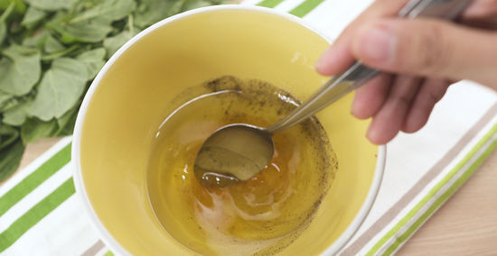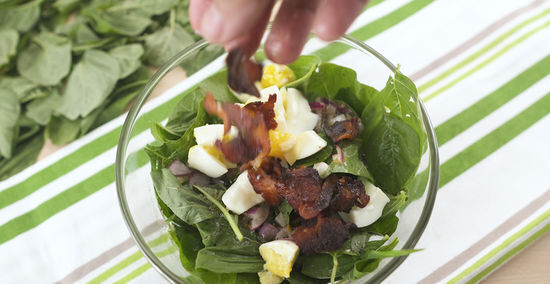 Transform your spinach into a Bermuda salad. Blend ⁄3 cup (79 mL) of cider vinegar, 1 chopped onion, 1 teaspoon (4.9 mL) of celery seed, 1 cup (240 mL) of olive or vegetable oil, 1 tablespoon (15 mL) of Dijon mustard, ⁄3 cup (160 mL) of white sugar, and salt and pepper to taste. Add chopped boiled eggs and bacon bits to the spinach leaves. This recipe will yield 8 servings.