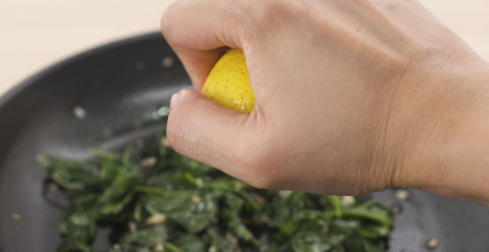 Try adding lemon juice for a bright, zesty flavor profile. Sauté 3 minced cloves of garlic in 2 tablespoons (30 mL) of olive oil over medium heat for a minute or two. Stir constantly to keep the garlic from burning. Add 16 ounces (0.45 kg) of spinach in handfuls and let it wilt. Remove the pan from the heat, and season the spinach with salt and pepper to taste. Squeeze ¼ of a small lemon over the spinach. Stir the ingredients to combine them. Don’t use bottled lemon juice because it’s too acidic. Top the dish with 2 tablespoons (30 mL) of lemon zest or peel. Zest the lemon by washing it and then running it over a cheese grater to create a pile of peel shavings. This recipe will yield 4 servings. Sour flavors like lemon can help balance out the bitter tastes of dark green vegetables.
