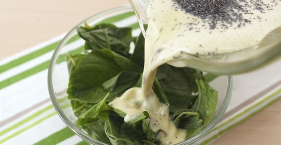 Try a poppy seed dressing for a richer, more filling salad. Mix an egg and 1 tablespoon (15 mL) of cider vinegar in a blender, then add ⁄3 cup (79 mL) of olive oil and ⁄3 cup (79 mL) of canola oil. Add ⁄3 cup (79 mL) of cider vinegar, minus the 1 tablespoon (15 mL) that you already used, 2 tablespoons (30 mL) of Dijon mustard, 3 tablespoons (44 mL) of honey, and ⁄2 teaspoon (2.5 mL) each of garlic powder and pepper. Pulse the ingredients until they're combined and add 1 tablespoon (15 mL) of poppy seeds. Pour the dressing over the spinach, along with bacon bits, sliced hard boiled eggs, red onion, mushrooms, and crumbled feta. Serve immediately. This recipe makes 4 servings. Make sure to pour the oil into the blender as slowly as possible to allow the mixture to emulsify, or thicken. You can use a hand blender instead of an automatic blender if you prefer. This poppy seed dressing will last in the fridge for about 3 days.