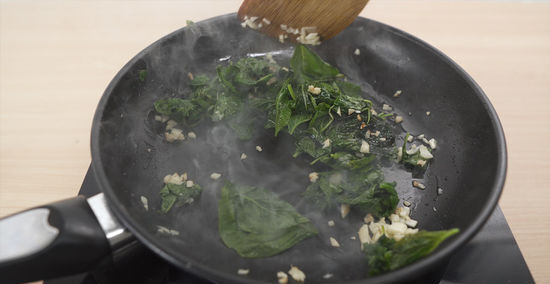 Sauté 1 pound (0.45 kg) of spinach with garlic for a simple, classic taste. Heat 2 tablespoons (30 mL) of olive oil in a skillet over medium heat. Add 4 minced cloves of garlic and sauté for 2 to 3 minutes. Add the spinach to the skillet a handful at a time, stirring it with a wooden spoon. As soon as the spinach starts to wilt, add the next handful and mix to ensure that the raw leaves are touching the bottom of the skillet. Remove the skillet from the heat as soon as all the spinach has been incorporated and wilted. This will yield about 4 servings of spinach. Spinach wilts quickly. The process shouldn't take longer than 5 minutes.