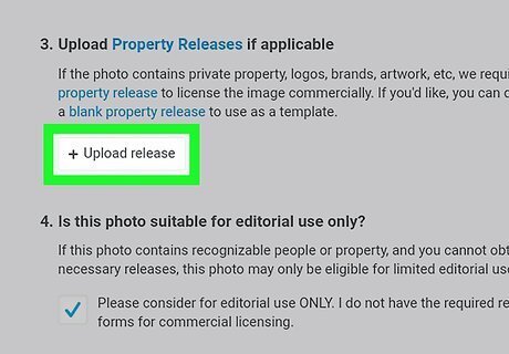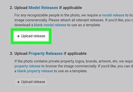 Tap MacButton to upload a property release form. It’s under the ″Upload Property Releases if applicable″ header (Step 3). You can download and print a property release form by clicking or tapping blank property release. If you’re not able to have property owners sign releases, you may still be able to sell the photo for editorial purposes. This means that your photo won’t be available for commercial use, which will likely limit your sales.
