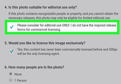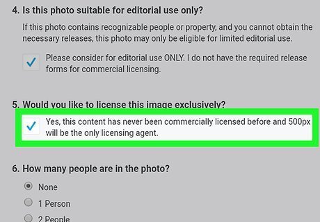 Choose whether to give exclusive rights to 500px. Make sure you know the difference between Exclusive and Non-exclusive rights before you set your preference: Exclusive use: If you’ve never licensed this image for commercial use, you can offer exclusive licensing to 500px to make 60% of all sales. However, this means you can’t offer the photo for sale anywhere but 500px. Check the box under Step 5 to agree to these terms. Non-exclusive use: If the photo has been licensed or you plan to license it elsewhere, do not check the box. You will still earn 30% of net sales with a non-exclusive license.