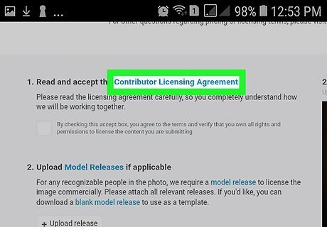 Tap Upload release to upload a model release form. It’s under the ″Upload Model Releases if applicable″ header (Step 4). If you’re not sure whether you need a form, see 500px’s model release guide. You can download and print a blank model release form by clicking or tapping blank model release. If you’re not able to have your models sign releases, you may still be able to sell the photo for editorial purposes. This means that your photo won’t be available for commercial use, which will likely limit your sales.