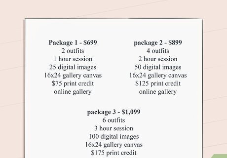 Offer different package levels to give your client options on deliverables. Packages are great ways to bundle your services for a base price so it’s easier for your client to decide what they want. Offer your very basic services for the lowest price package, and add new things to each level, such as additional editing services, longer shoot times, and more prints. Raise your prices by about 25–50% between each of your package options so your clients don’t feel like they’re getting ripped off for different levels. For example, a base wedding package could cost $2,500 and include 6 hours of shoot time, access to an online gallery, and a DVD. A premium wedding package could cost $3,800 and include 10 hours of shooting time, an engagement photo session, and a photo album as well as the gallery and DVD from the original package. The prices for your packages depend on what services you offer and how long it takes you to complete them.Warning: Only offer 3–4 packages, or else it could be overwhelming for your client to choose one they want.