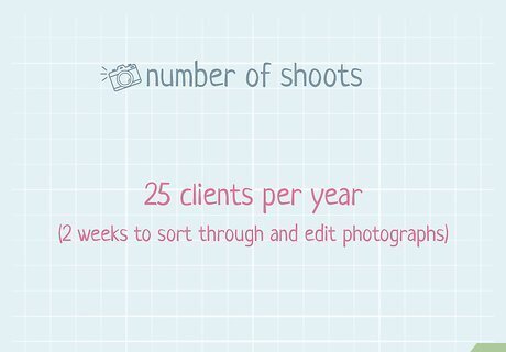 Estimate how many shoots you think you’ll complete each year. If you’ve already established yourself as a photographer, look at how many shoots you scheduled in the past year to use as a reference. If you haven’t started yet, think about how long it takes you to shoot and edit photos on a regular basis. Consider how many projects you’re comfortable doing per week or month so you can figure out how many clients you can take throughout the year. For example, if it usually takes you 2 weeks to sort through and edit photographs, you could estimate that you’ll get about 25 clients per year. Wedding photography can be more challenging to book since the peak seasons only last for a few months every year.