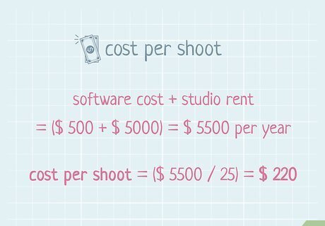 Calculate the cost of your photography-related expenses per shoot. Your overhead includes the price of anything that you regularly use during your shoot. This may include studio rentals, equipment, and software licenses. Add up the total amount of your expenses that you would normally have each year for your photography, and divide it by the number of shoots you estimated. That way, you’ll know how much you need to make to break even. For example, if you use software that costs $500 USD per year and rent a studio that’s $5,000 USD annually, add 5,000 + 500 = $5,500 USD. If you think you’ll do 25 different shoots, then your calculation would be 5,500/25 = $220 USD of expenses per shoot. You can also find the price per hour if you usually shoot different lengths of times or events. For example, if your overheads cost $5,500 USD annually and you plan on working 500 hours on shoots per year, then your calculation would be 5,500/500 = $11 USD per hour.