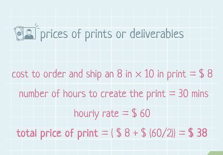 Add the total prices of prints or deliverables to your base price. If you plan on giving digital copies of your prints, include the price of external hard drives or cloud storage in your expenses. If you plan on offering prints, find out how much it costs to get them printed from a photo lab so you can include them in your price. Be sure to also charge for the amount of time you spent for ordering the prints, shipping them, and inspecting them for quality. For example, if it costs $8 USD to order and ship an 8 in × 10 in (20 cm × 25 cm) print and you spend 30 minutes working on it, charge half your hourly rate plus the price of the print. If your hourly rate is $60 USD, then the print would cost 30 + 8 = $38 USD for a print. The prices for deliverables depend on what you order, how long it takes to work on them, and the sizes of any prints. Only charge for the amount of time you spend actively working on the picture and not for the time you spend waiting for it to print or ship.