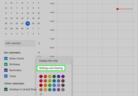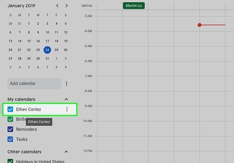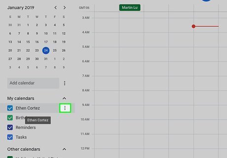 Hover your pointer over the calendar you want to share. Your calendars are listed on the left side of the window under "My calendars." If necessary, click the Android 7 Expand More icon next to the "My calendars" heading in order to expand your calendar list.