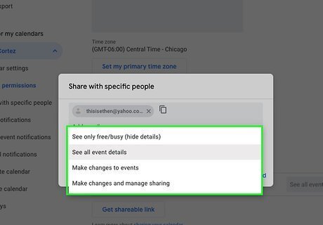 Select a permission setting. The permissions options are: See only free/busy (hide details) See all event details Make changes to events Make changes and manage sharing